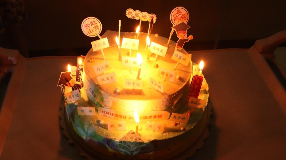 随后,毕业生代表将早已备好的蛋糕推入现场。蛋糕上插着每位毕业生的姓名,寓意“聚是一团火,散是漫天星”。祝愿每一位毕业生都能够在新的工作岗位中发光发热,心想事成。在场的三位老师共同为毕业生们切分蛋糕,并向大家送上祝福。