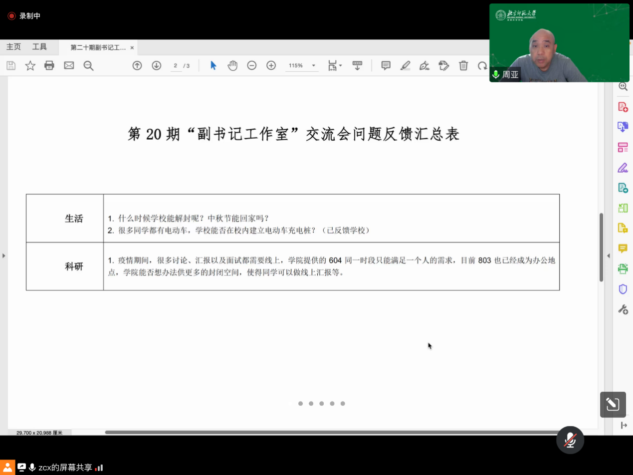 问题1: 疫情期间,很多讨论、汇报以及面试都需要线上,学院提供的604同一时段只能满足一个人的需求,目前803也已经成为办公地点,学院能否想办法供更多的封闭空间,使得同学可以做线上汇报等。