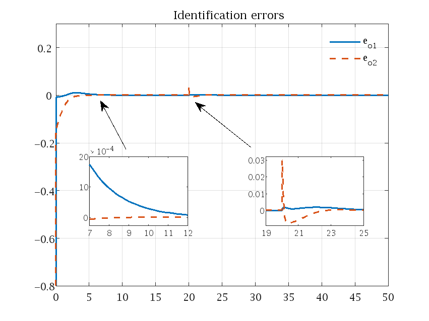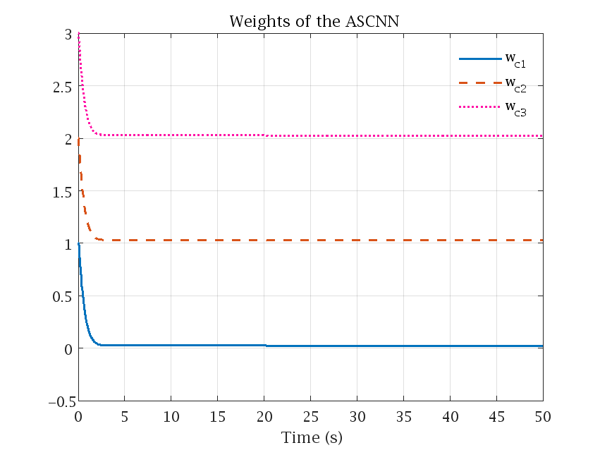 作者设计的安全调控系统原理结构示意图如图1所示。在该工作中,作者首先将两个玩家(控制输入和执行器故障)视为具有竞争行为的二体SLS系统,并将两个玩家同时引入设计系统的成本函数,进而构建HJI方程。然后,利用径向基神经网络建立一个辨识系统来学习未知的系统动力学模型信息。通过构建由协作自适应律调节的渐近稳定评判神经网络,求解HJI方程,获取近似最优安全调控策略。图2表示的是辨识系统的辨识误差演化轨迹,可以看出在短时间内,辨识误差可以被驱动到零。图3表示的是系统在t="20s发生执行器故障时,在神经最优安全调控策略的作用下,可以驱动系统状态收敛到平衡状态。图4表示的是评判网络权值演化轨迹。图5是两个玩家的演化轨迹,在t="20s发生执行器故障时,控制玩家和故障玩家的演化轨迹具有相反的趋势。这是由于在系统发生故障后,执行器故障会降低系统的控制性能,而系统最优控制为了对抗执行器故障的作用,以维持系统安全可靠的运行,故在短时间内会呈现波动。随着系统的演化,两者可以在短时间内达到稳定状态,即两个参与者达成了相互协议。