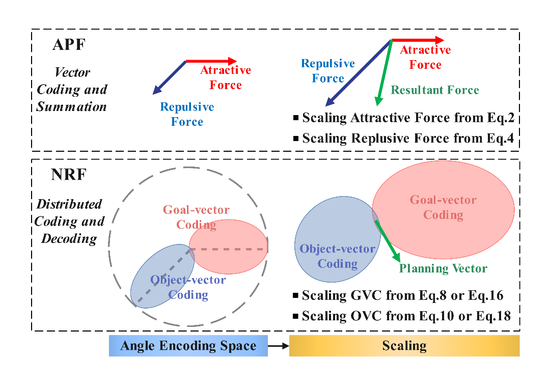 本研究聚焦于自动导航系统中的路径规划核心问题。传统的人工势场(Artificial Potential Field, APF)算法因其简单高效而广泛应用于无人驾驶、机器人路径规划等领域。然而,该方法在复杂环境下存在目标不可达、局部最小点陷阱等问题(如图1所示)。为此,研究团队提出了一种神经科学启发的改进算法——神经感受野法(Neuro-Receptive Field, NRF),通过引入类脑的分布式编码机制(如图2所示),在力场建模中引入神经感受野的概念,重构吸引与排斥力的计算模型。
