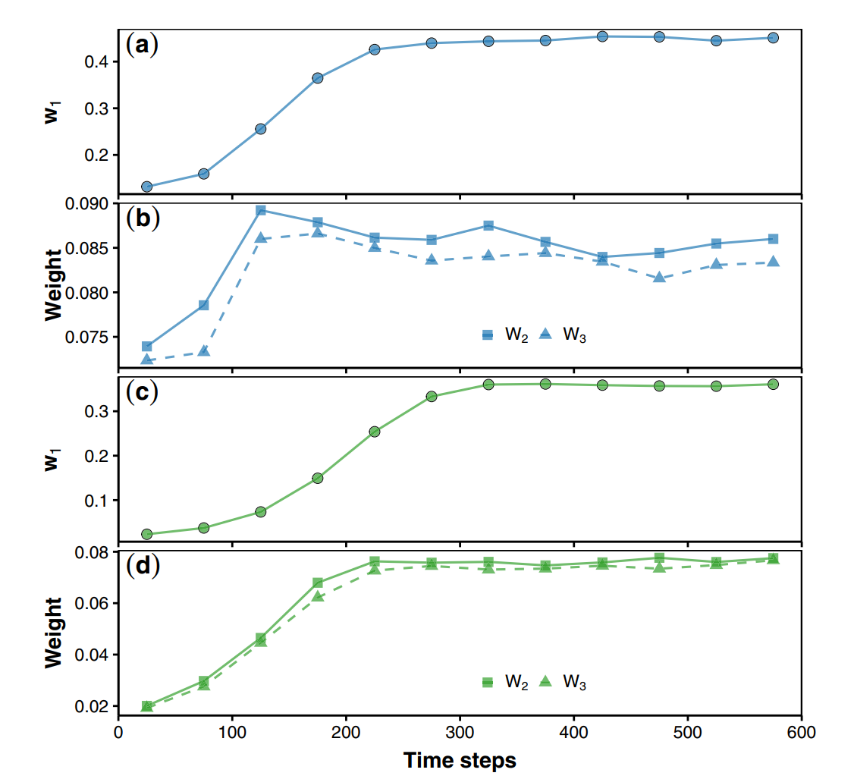 图1. 吸收态向自组织临界态的演化与本征微观态的凝聚。(a)和(b)展示BTW模型的结果,随机规则的Manna模型的结果展示在(c)和(d)。
