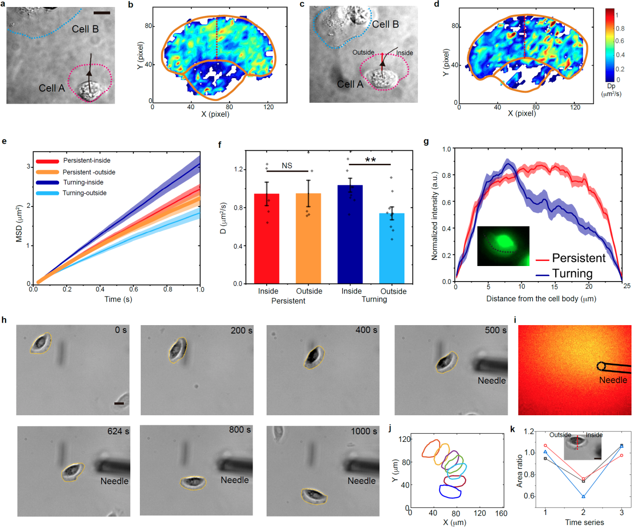 图3. 细胞转向过程中的胞内扩散和伪足三维结构出现左右对称性破缺:处于转向外侧的伪足变厚且内部扩散速度下降。