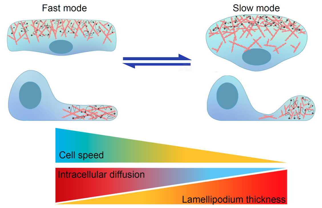 已有研究表明,当微丝的末端与伪足前端细胞膜接触时才能持续延长,因此,当细胞处于正常的快速迁移模式时,只有近似垂直于膜的微丝才能快速聚合,以保持与前端细胞膜的持续触。当细胞速度开始要减慢,更多朝向的微丝在细胞前端形成,导致板状伪足前端膨胀而后端压缩(细胞总体积保持不变),让伪足内的生物大分子被挤到前端,造成伪足前端分子拥挤程度增加以及内部扩散速度相应地下降,从而细胞转为慢速迁移模式。而当细胞膜前进速度开始要增加时,微丝的密度逐步降低,板状伪足恢复至扁平形态,胞内扩散变得均匀,细胞从而由慢速迁移模式转换回快速模式。在转向的细胞中,细胞两侧伪足的速度不平衡,外侧收缩而内侧扩张。由于外侧伪足的细胞膜前进速度降低,导致该侧的微丝网络变得密集,局部分子拥挤变强,导致外侧伪足厚度增加以及内部扩散速率下降。
