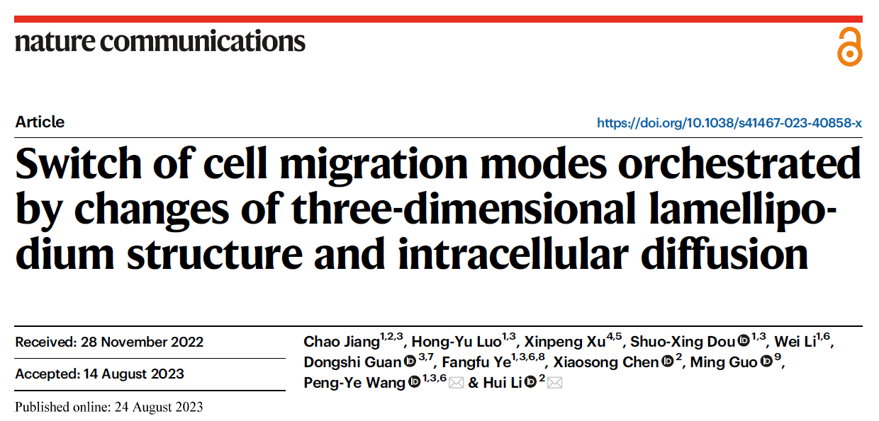 文章信息:Chao Jiang, Hong-Yu Luo, Xinpeng Xu, Shuo-Xing Dou, Wei Li, Dongshi Guan, Fangfu Ye, Xiaosong Chen, Ming Guo, Peng-Ye Wang & Hui Li. Switch of cell migration modes orchestrated by changes of three-dimensional lamellipodium structure and intracellular diffusion. Nature Commun. 14, 5166 (2023).