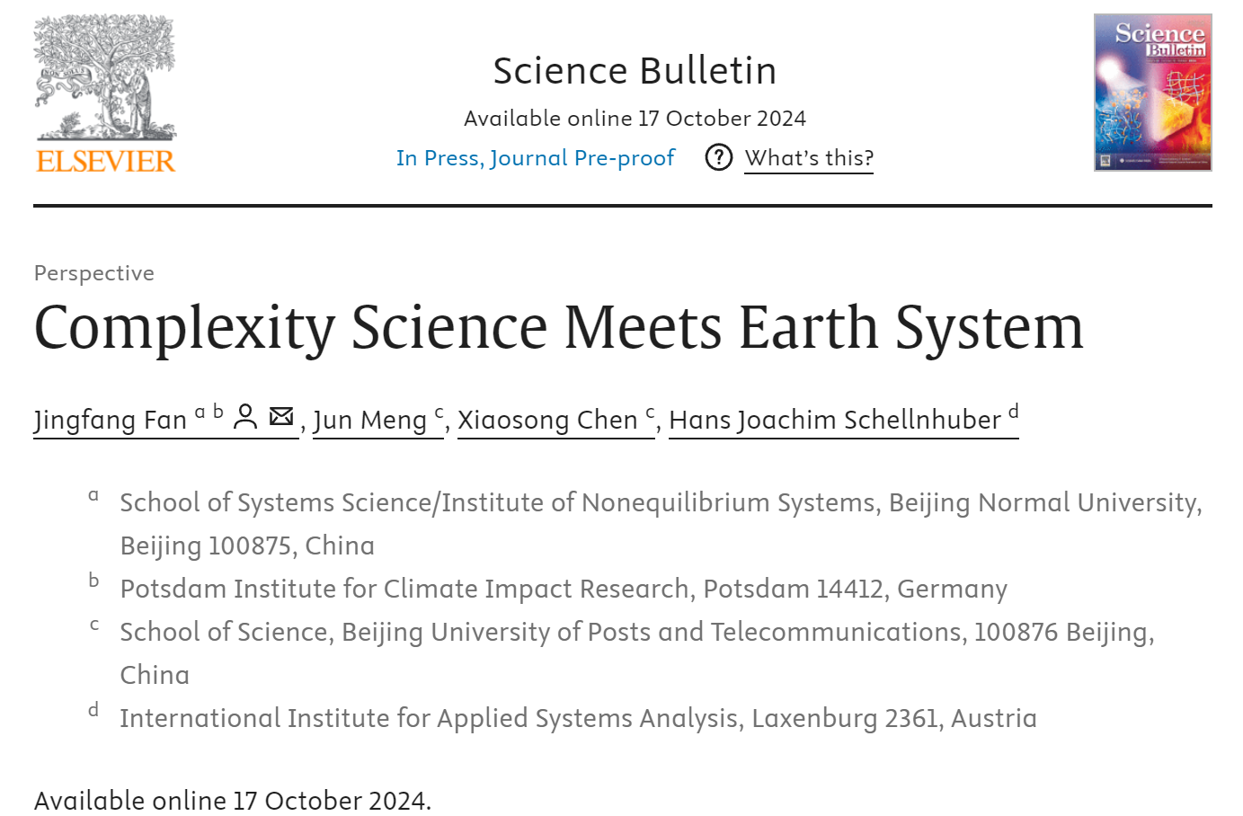 近日,成人色情 樊京芳教授的最新观点论文《Complexity science meets Earth system》在线发表于Science Bulletin,该期刊为国际知名综合类学术期刊,影响因子为18.9。此研究为系统科学在地球系统研究中的应用提供了全新视角。该研究由成人色情 、北京邮电大学和奥地利国际应用系统分析研究所等多家研究机构联手完成,其中成人色情 樊京芳教授为论文第一作者和通讯作者。论文的合作者包括孟君研究员、陈晓松教授以及Hans Joachim Schellnhuber教授。