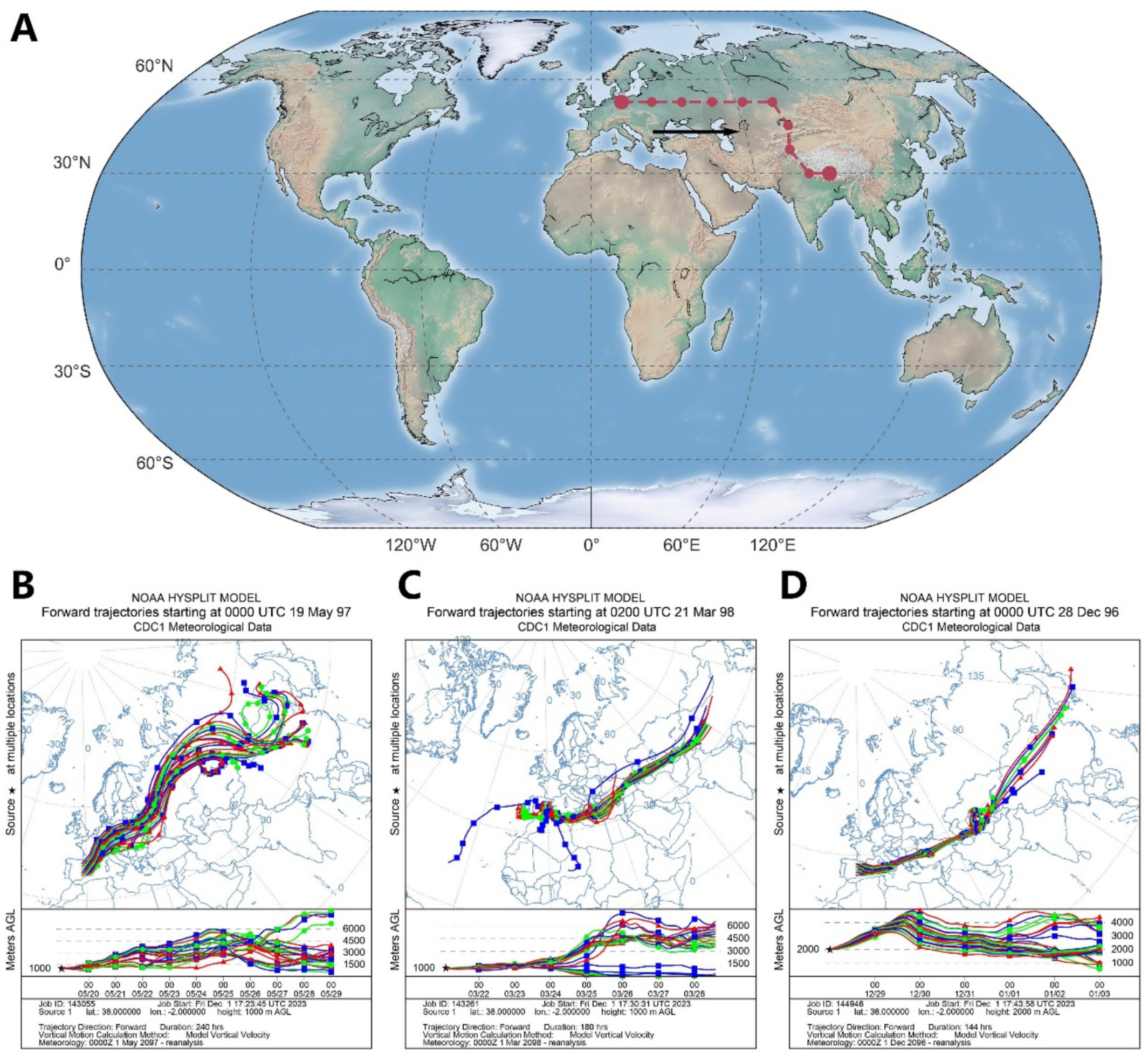 研究发现,青藏高原与亚马孙地区在全球干旱网络中具有极高的“介数中心性”,是连接各大洲干旱传播路径的关键“枢纽”,在全球气候系统中扮演着重要的调节角色。团队还利用HYSPLIT拉格朗日轨迹模式验证了欧洲—青藏高原之间的水汽输送路径,与网络分析结果高度一致,从物理层面印证了干旱跨洲际传播的机制,如图2所示。
