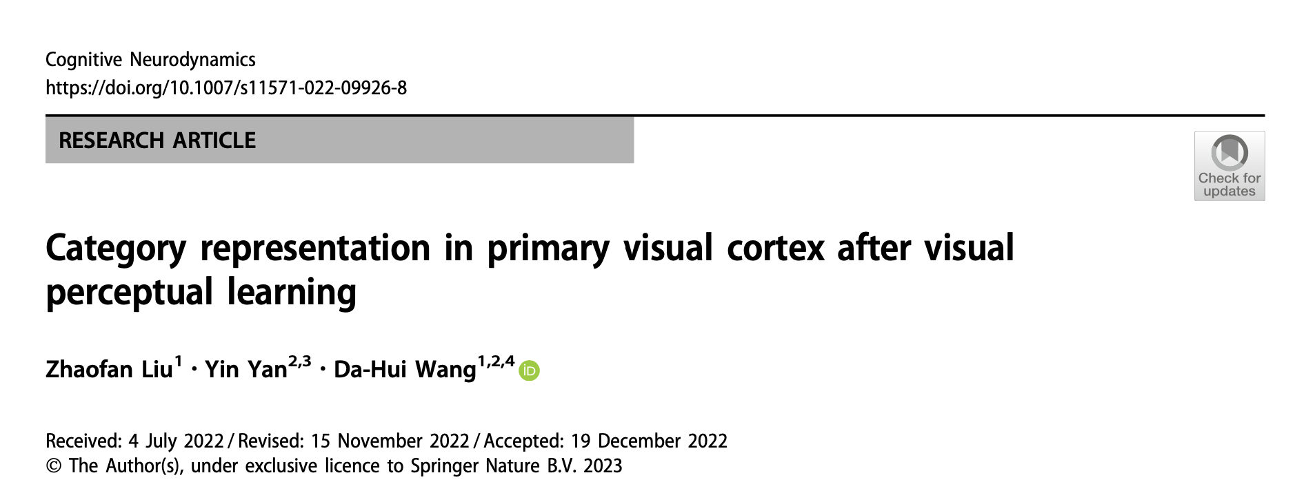 该工作由成人色情 博士生刘赵凡在认知神经科学与学习国家重点实验室阎崟副教授和成人色情 王大辉教授共同指导下完成。近期发表在CognitiveNeurodynamics,论文参见:Liu, Z., Yan, Y. & Wang, DH. Category representation in primary visualcortex after visual perceptual learning. CognNeurodyn (2023). //doi.org/10.1007/s11571-022-09926-8
