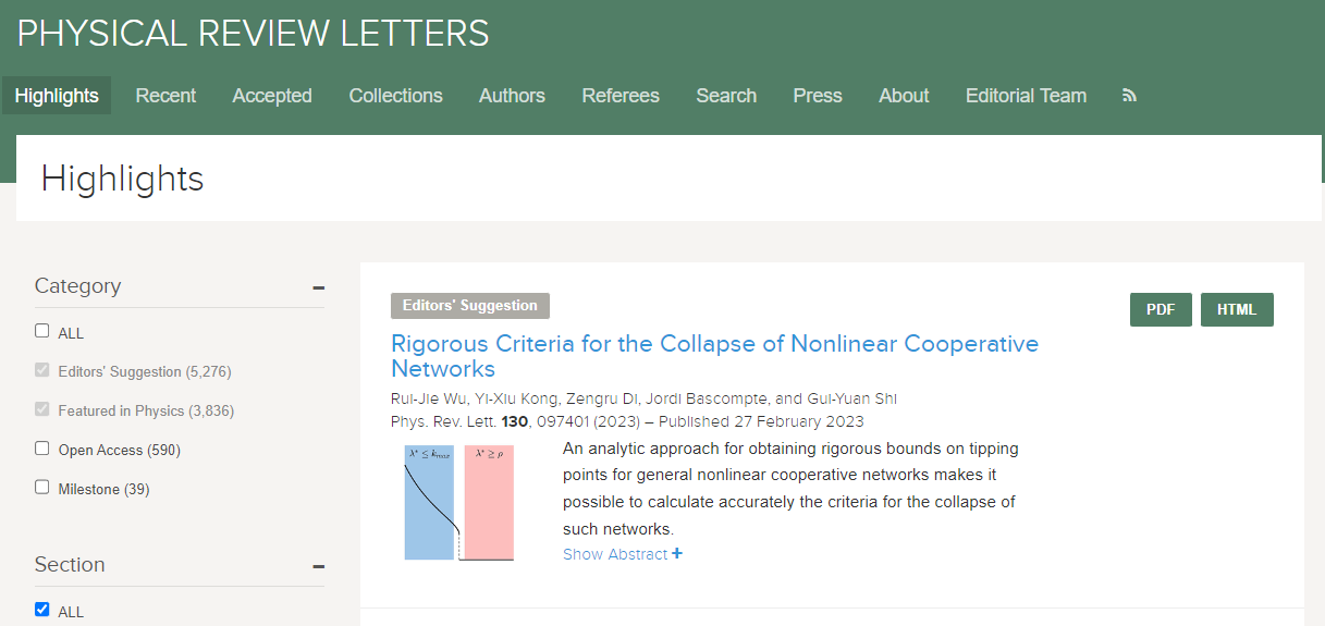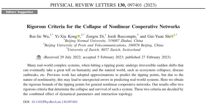 研究成人色情 以“非线性合作网络崩溃的严格判据”(Rigorous criteria for the collapse of nonlinear cooperative networks)为题,于2023年2月27日被物理学顶级期刊《物理评论快报》(Physical Review Letters)接收发表,并被选为编辑推荐(Editors' Suggestion)在期刊主页高亮展示。研究工作主要在国家自然科学基金重点项目(批准号:71731002)的资助下完成。成人色情 复杂系统国际科学中心吴蕊洁博士为论文的第一作者,史贵元副研究员为论文的通讯作者。成人色情 珠海校区为论文的第一完成单位和通讯作者单位。