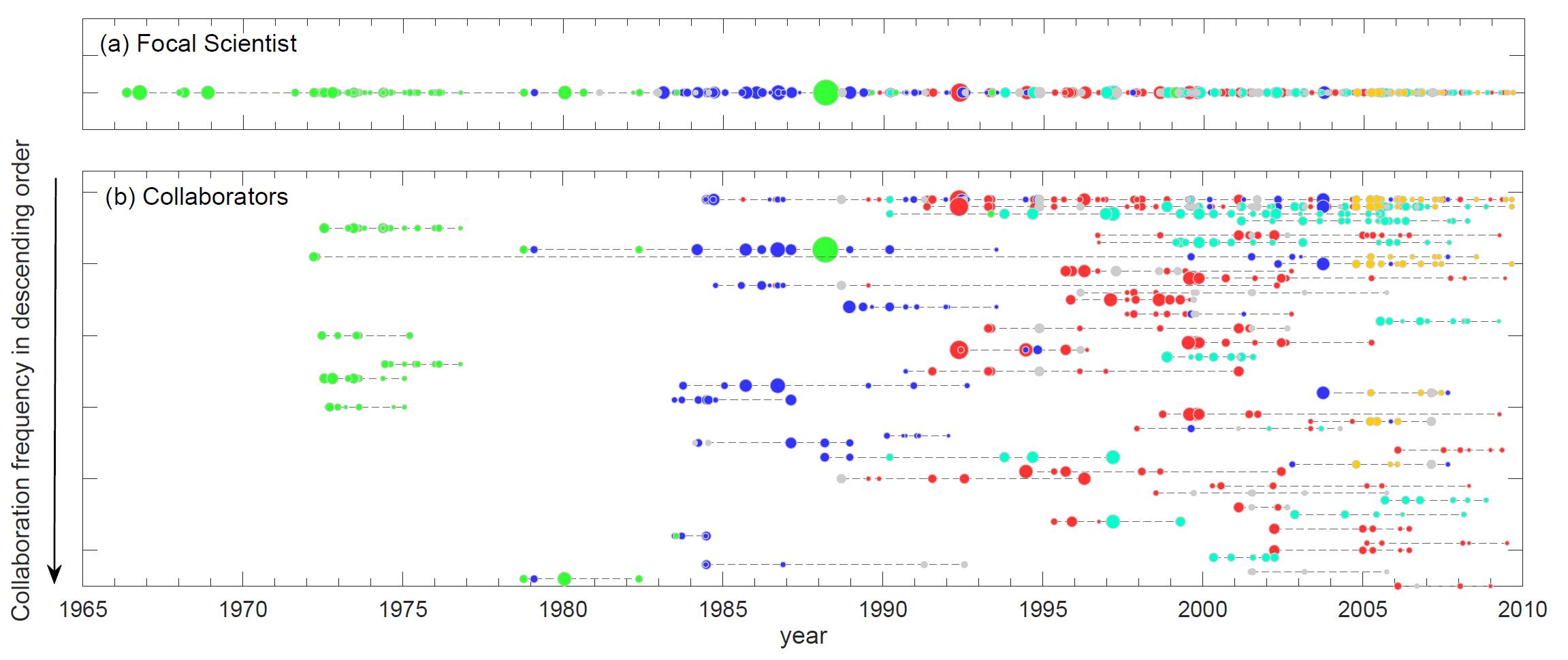 图1,(a)一个典型的科学家整个科研生涯的发文序列。其中每一个点代表一篇论文,点的颜色代表论文所属的研究主题。(b)该科学家与每个合作者合作的论文序列,每一行是一个合作者在合作中涉及的论文序列。合作者按照合作频次从上到下排列。此图显示虽然该科学家的研究涉及多个主题,但大部分合作者只投入他少数主题的研究。