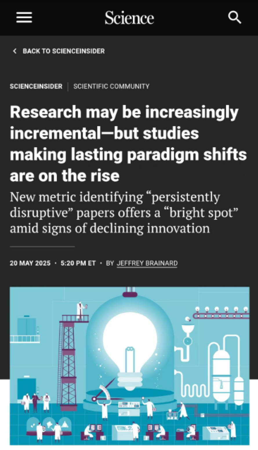 该论文一经发表,受到广泛关注。论文于5月20日被Science正刊长文报道,见图2(//www.science.org/content/article/research-may-be-increasingly-incremental-studies-making-lasting-paradigm-shifts-are)。