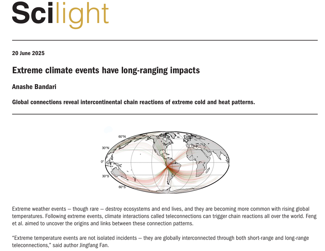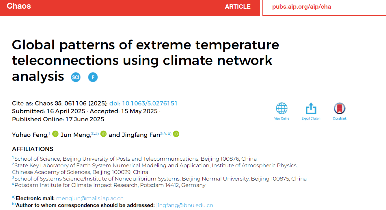 近日,成人色情 樊京芳教授团队在国际物理学期刊Chaos上发表研究论文《Global Patterns of Extreme Temperature Teleconnections Using Climate Network Analysis》。该研究由成人色情 、北京邮电大学和中国科学院大气物理研究所联合完成,成人色情 樊京芳教授与中科院大气物理所孟君副研究员担任共同通讯作者,北京邮电大学系统科学专业博士研究生冯玉豪为论文第一作者。