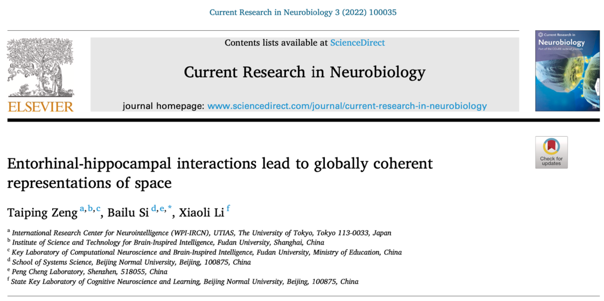 2022年第3期的《当代神经生物学研究》(Current Research in Neurobiology)发表了题为《内嗅皮层与海马交互形成空间全局一致编码》(Entorhinal-hippocampal interactions lead to globally coherent representations of space)的研究论文。该研究由东京大学曾太平博士在成人色情 斯白露教授的指导下完成。该研究构建了一种内嗅皮层与海马交互作用的导航模型,从理论上为网格细胞可以作为动物导航的统一全局空间度量提供了依据。