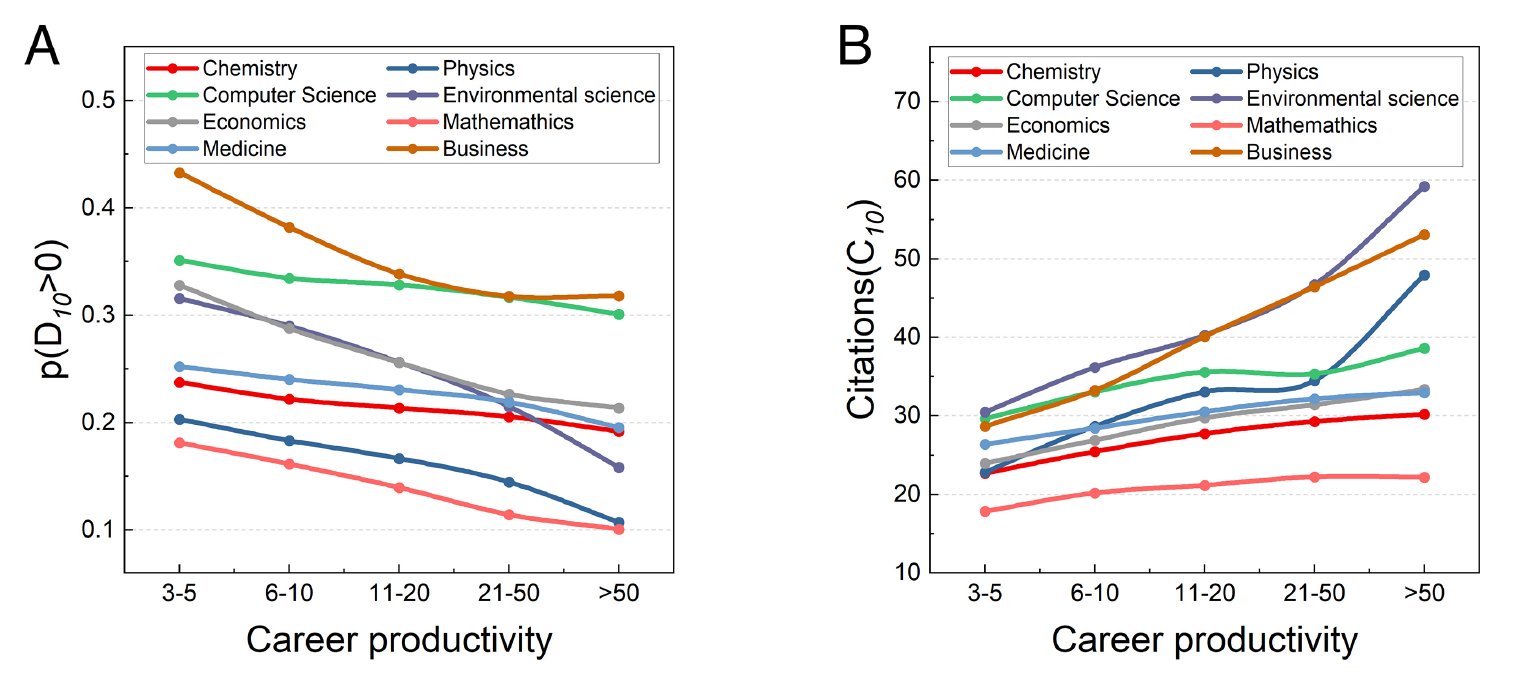 (图1,(A)科学家产量和论文中颠覆性指标为正的论文占比之间的关系,(B)科学家产量和论文10年平均引用之间的关系。为了清楚的展示出趋势,此图只展示了所有19个学科中8个学科的结果。)
