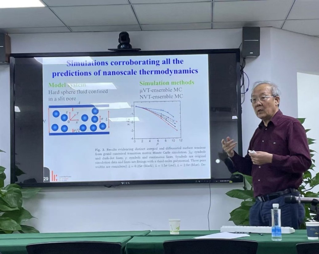 报告中,董教授指出当分离压(Disjoining Pressure)出现时,存在着积分压强与微分压强不相等的情况存在,可以根据分离压来定义小物系系统,并首次提出了分离压的孪生概念分离化学势(Disjoining chemical potential)的概念。通过分子模拟的方法验证了微分和积分表面张力等新概念的存在性,验证了小物系中的系综不等价性。董教授所提出的新理论与传统的小物系热力学不同,该方法所提出的新热力学量均可通过实验验证,目前董教授团队已初步获得了部分实验结果。该理论为研究纳米尺度的小物系热力学实验验证提供了一个非常有吸引力的视角。