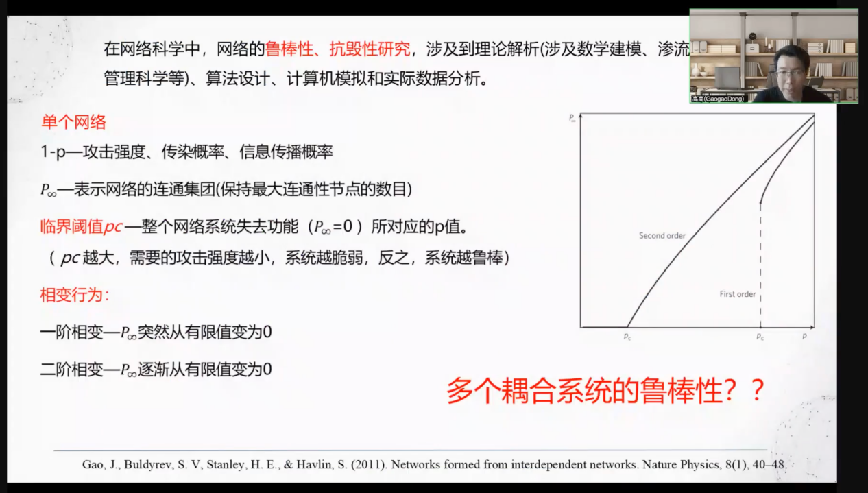 2022年10月11日下午15:30,江苏大学数学科学学院的董高高副教授在教八205教室做了题目为“广义复杂网络下的级联行为及中微观尺度下的网络鲁棒性分析”的报告。董高高老师分享了实际系统非均匀的异质耦合模态的级联行为的理论表达,发现当广义的耦合网络系统存在着最佳的耦合结构。讲座由成人色情 樊京芳老师主持,现场有成人色情 近90位师生参与了讨论。