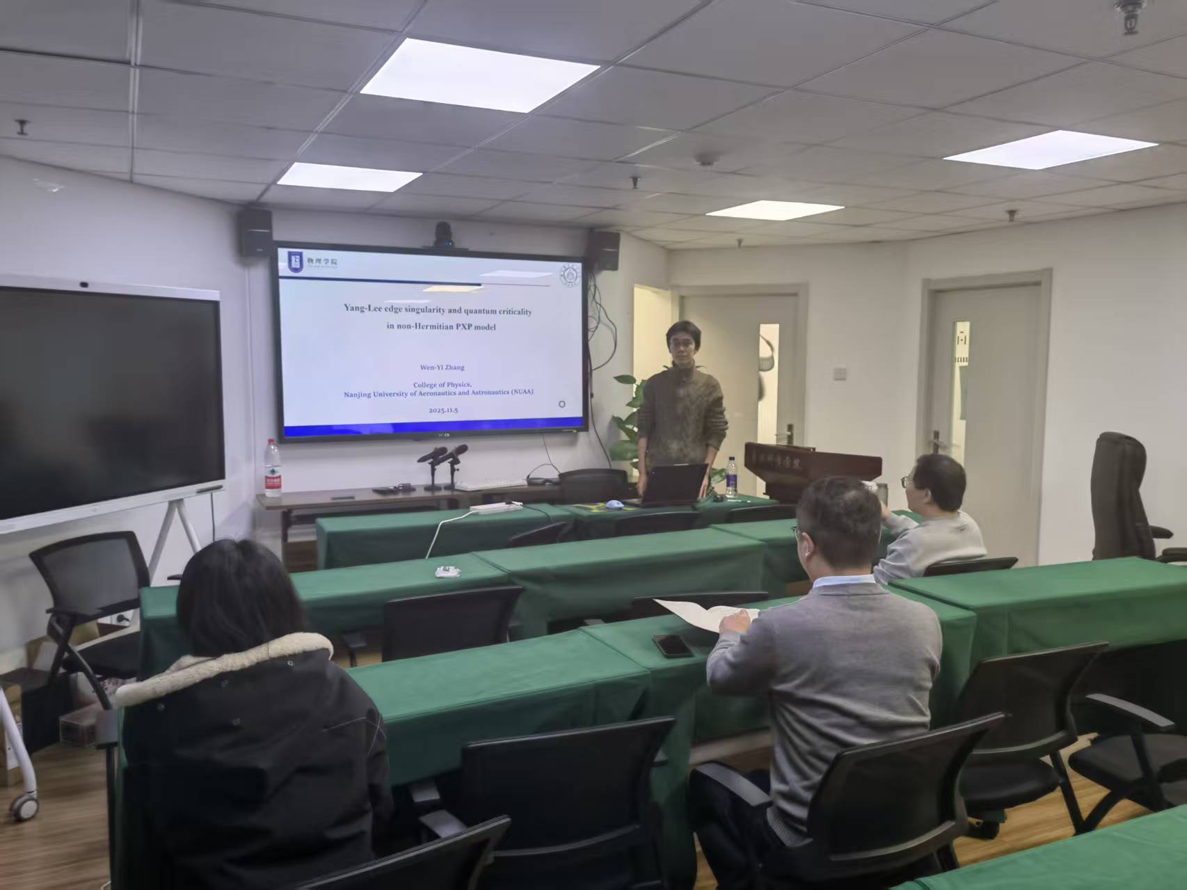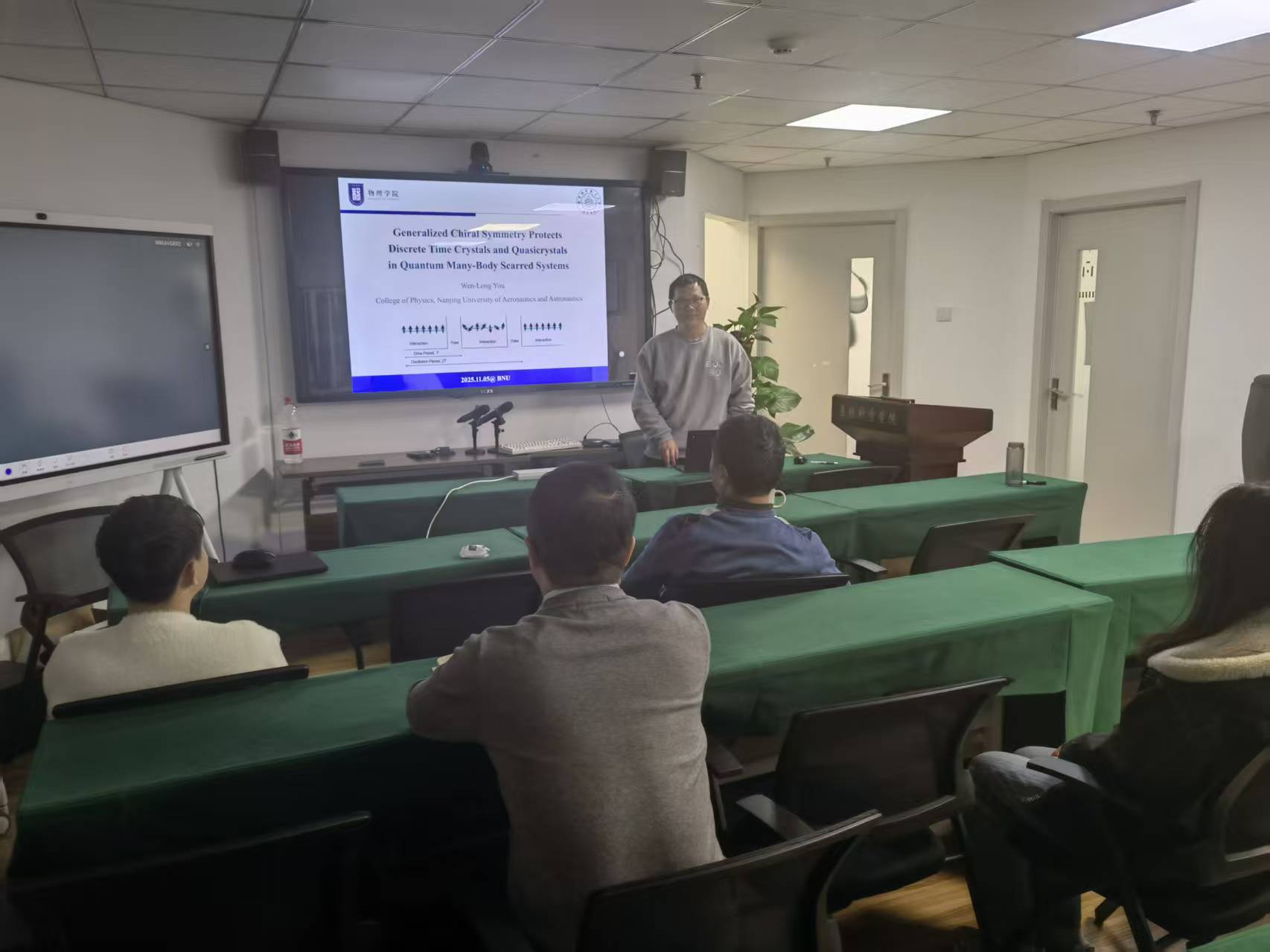 近日,复杂量子系统研究专家南京航空航天大学物理学院尤文龙研究员及其团队优秀博士研究生张文乙同学应邀来访成人色情 ,围绕量子复杂系统领域开展学术交流,并于2025年11月5日上午和下午为全院师生作了专题讲座。