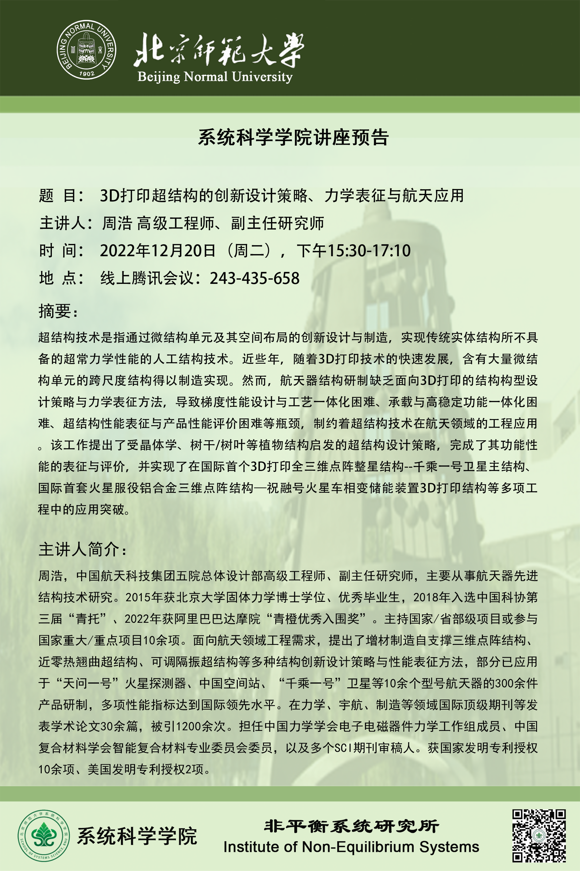 【讲座】3D打印超结构的创新设计策略、力学表征与航天应用