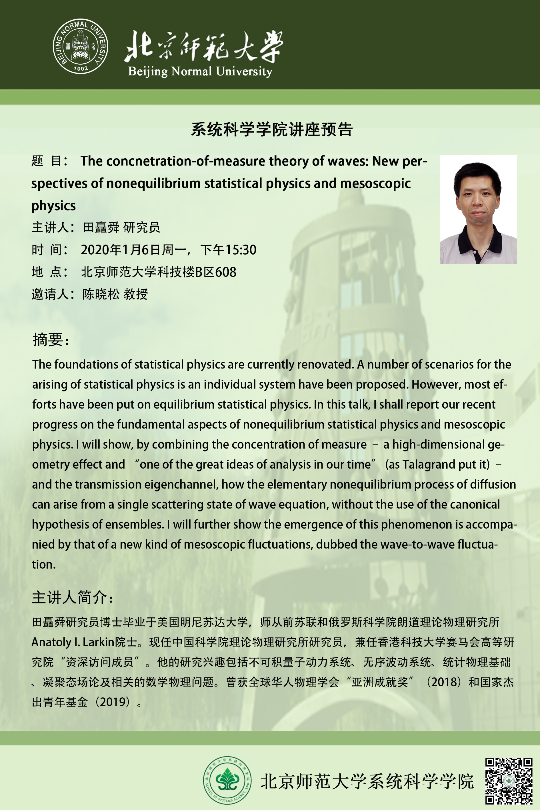 【讲座】 The concnetration-of-measure theory of waves: New perspectives of nonequilibrium statistical physics and mesoscopic physics