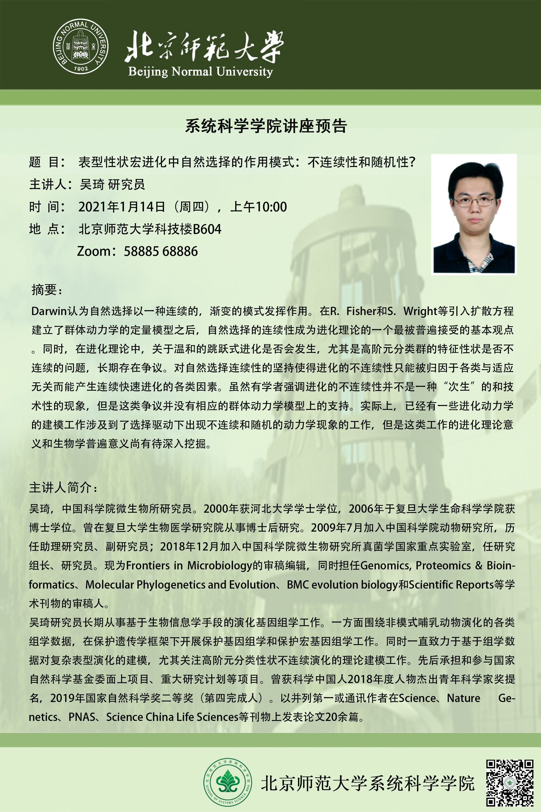 【讲座】表型性状宏进化中自然选择的作用模式:不连续性和随机性?