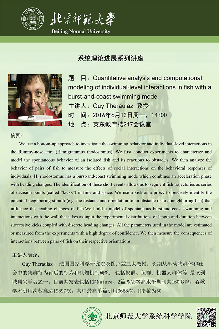 [讲座] Quantitative analysis and computational modeling of individual-level interactions in fish with a burst-and-coast swimming mode