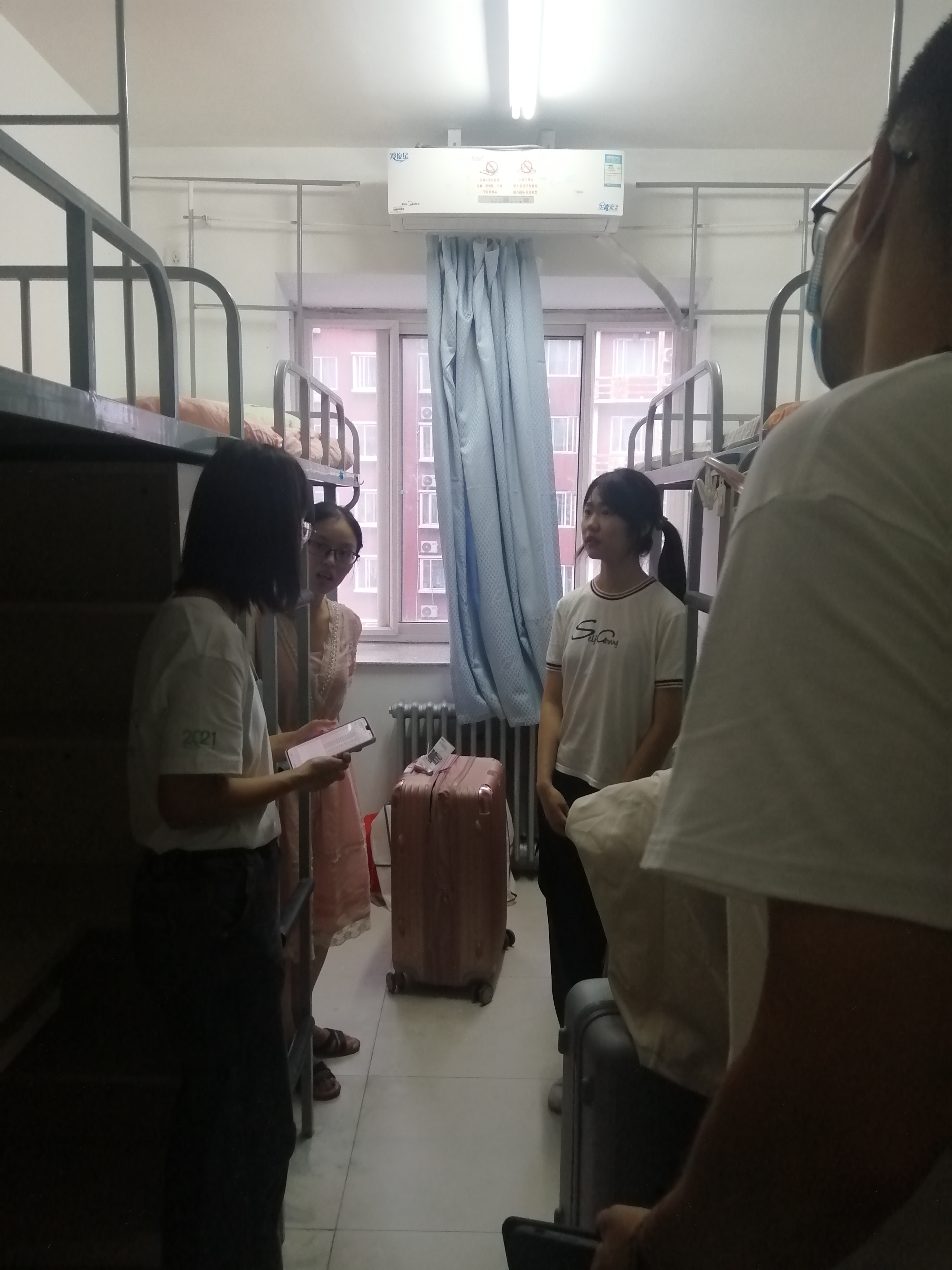 2021年9月5日下午17:00,紧张而忙碌的迎新工作收尾。下午17:30,团委书记王娟、研会主席陈娜和团委副书记任峻泽一起走访本部校区成人色情 新生宿舍。他们带去了学院对新生同学们的温暖关怀。他们依次前往学十六、学十五、学四、学三走访成人色情 新生宿舍。
