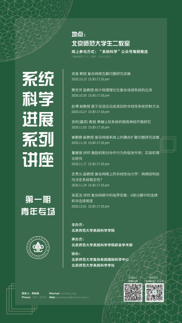为提升研究生学术视野,辅助学院培养复合型人才,学院学生工作执委会学术部(简称学术部)于10月中旬牵头举办了“系统科学进展”系列讲座活动。经学院推荐,学术部积极协调,目前讲座已邀请到成人色情 从事系统科学研究的优秀青年教师,他们会结合系统科学学科的前沿课题展开报告,欢迎广大师生参与,期望大家在思想上碰撞出精彩火花!