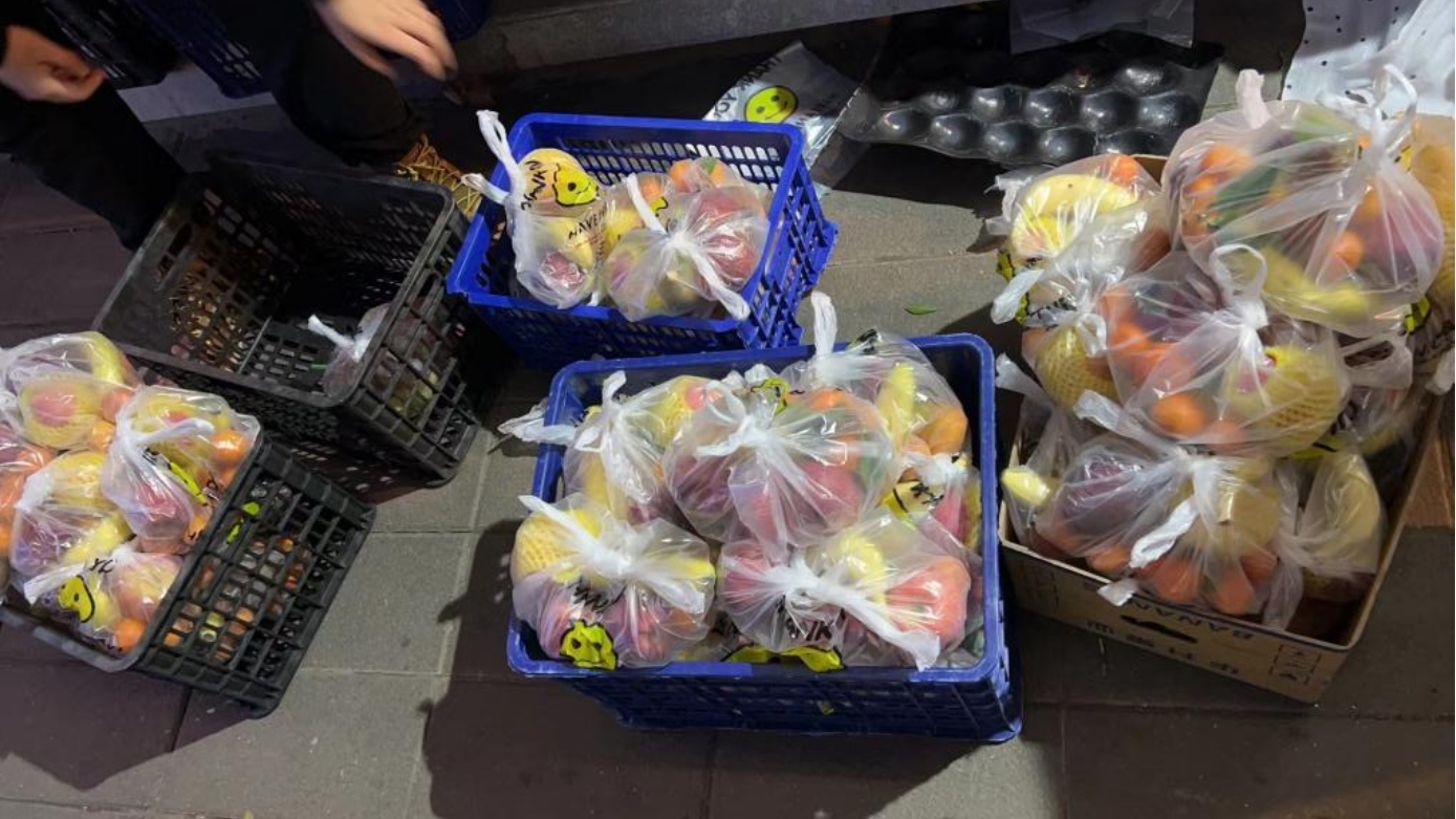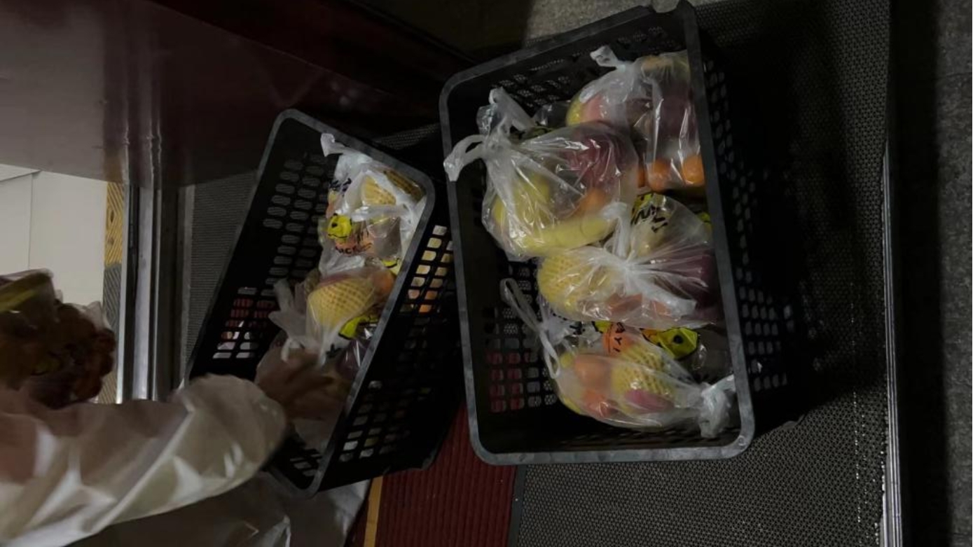 志愿者在校园小吃街水果店购买水果后分类打包运至学三、学十六楼下,由各班、各宿舍派代表下楼领取。
