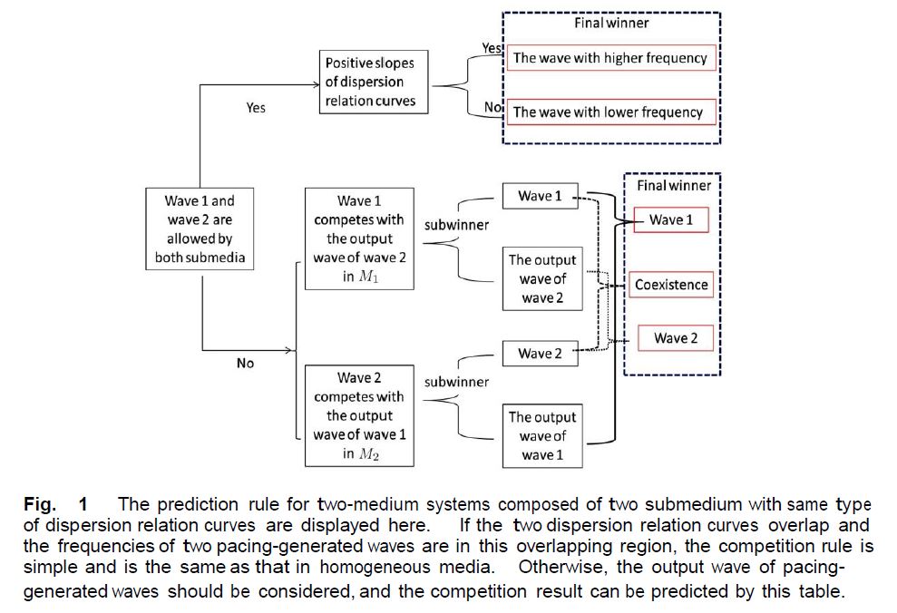 波的相互竞争是物理研究,尤其是斑图控制研究中的热门领域。各种波竞争动力学基础的研究能够更好的为实际应用提供支持。在这些研究中波竞争结果的预估是有重要价值的基础研究之一。本文中,我们详细研究了非均匀Brusselator系统中波竞争结果的预估。我们提出了一个简单的判断波竞争方法,只需要考虑介质的色散曲线和波的不同来源就能断定波的竞争结果。我们数值验证了该方法的可靠性,并且使用该方法对波传播结果进行了准确的预测。该方法还可用于确定在非均匀介质中的得到给定频率波的具体方案。这个方法可以推广到其它非线性反应扩散系统中,具有普适性。