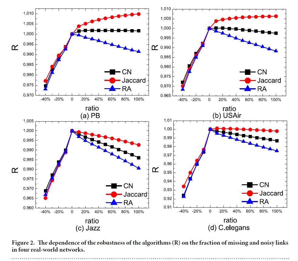 链路预测算法的核心是估算网络中任意两点之间存在连边的可能性。至今,很多高精度的链路预测算法已经被提出。然而,这些算法的精确性都是在无噪音信息下的网络中估算的。当网络可观测的连边信息不再准确的情况下,这些链路预测算法的预测精度会如何变化是一个重要的问题,至今尚未解决。在本文中,我们系统的研究了现有的22种链路预测算法精度受网络中缺失连边,虚假连边,重连连边的影响。我们发现缺失连边比虚假和重连连边对预测精度影响更大,我们还提出了一个指标来定量化这种影响。在这些链路预测算法中,我们发现一些算法虽然精度略低,但是它们能在存在噪音信息的网络中表现稳定。
