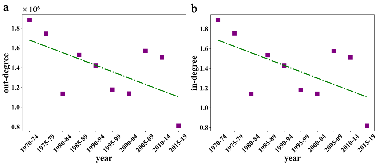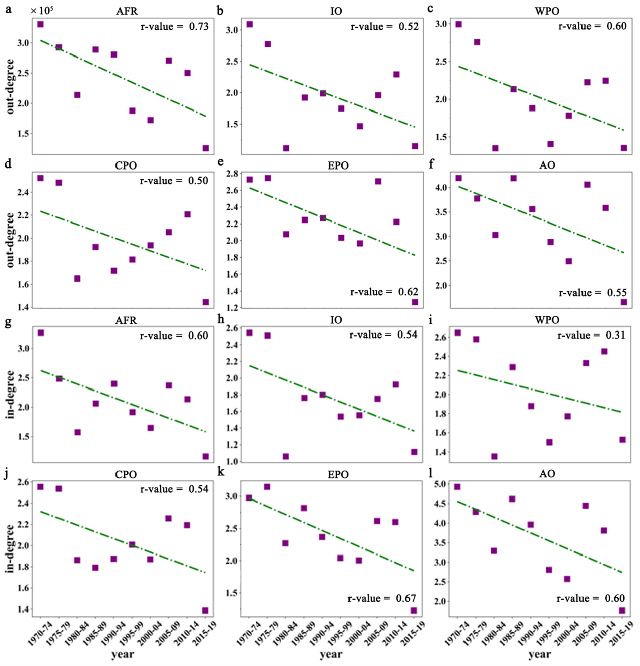 在该论文中,作者基于全球10512个观测格点的500hpa位势高度分别建立了两种不同类型的正、反同步网络,并发现它们不一样的特征:正同步网络主要分布在热带地区,有向度分布是自东向西的,而反同步网络主要分布在南北半球的中纬度地区,有向度分布是自西向东的(图1所示);正同步网络边的距离分布呈幂律(power-law)衰减,该同步关系主要是由热带环流造成的,而反同步网络边的距离分布在3000公里处有一个峰值,恰好与Rossby波的半波长相一致(图2所示)。基于1970至2019共50年的数据,每5年分别建立正同步网络,得到热带地区的出、入度,可以发现热带地区的出、入度在不断减小(图3所示),这说明热带环流正在减弱。为进一步分析热带不同区域环流减弱是否有差别,热带地区被划分为非洲、印度洋、西太平洋、中太平洋、东太平洋和大西洋6个区域,并分别计算这6个区域50年间出、入度的年代际变化(图4所示)。可以发现非洲和大西洋的环流减弱效应最为显著。