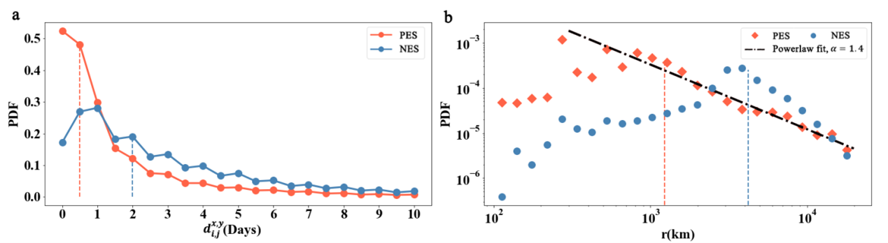 (a)为正、反同步网络中同步事件时间间隔的概率密度分布,(b)为同步地点间距离的概率密度分布.