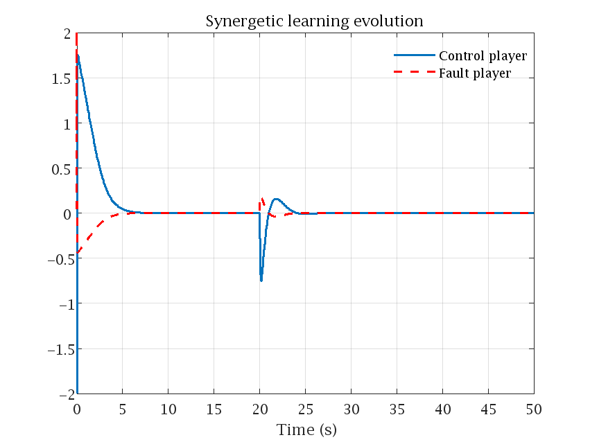作者设计的安全调控系统原理结构示意图如图1所示。在该工作中,作者首先将两个玩家(控制输入和执行器故障)视为具有竞争行为的二体SLS系统,并将两个玩家同时引入设计系统的成本函数,进而构建HJI方程。然后,利用径向基神经网络建立一个辨识系统来学习未知的系统动力学模型信息。通过构建由协作自适应律调节的渐近稳定评判神经网络,求解HJI方程,获取近似最优安全调控策略。图2表示的是辨识系统的辨识误差演化轨迹,可以看出在短时间内,辨识误差可以被驱动到零。图3表示的是系统在t="20s发生执行器故障时,在神经最优安全调控策略的作用下,可以驱动系统状态收敛到平衡状态。图4表示的是评判网络权值演化轨迹。图5是两个玩家的演化轨迹,在t="20s发生执行器故障时,控制玩家和故障玩家的演化轨迹具有相反的趋势。这是由于在系统发生故障后,执行器故障会降低系统的控制性能,而系统最优控制为了对抗执行器故障的作用,以维持系统安全可靠的运行,故在短时间内会呈现波动。随着系统的演化,两者可以在短时间内达到稳定状态,即两个参与者达成了相互协议。