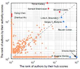 我们以复杂系统研究领域作为实证对象,比较了传统无向合作网络与有向合作网络的统计特征;在有向合作网络使用几种经典的节点中心性判别指标(介数、PageRank、SIR、HITS)来识别重要科学家,并给出了这些科学家的合作模式分类。(如下图)