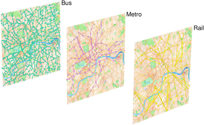 作 者使用了多层网络架构来识别这个整合的运输系统的多模态特征,同时将每种运输模式作为单独的一层。为了专注于该系统的多模态方面,作者使用了粗粒化过程来 处理数据,同时明确界定了不同运输方式之间的耦合,如机场、轮渡码头、铁路、地铁、长途汽车和公交车站之间的连接。作者用网络理论的标准格式来记录由此产 生的加权的、定向的、时间的、多层的网络,以确保静态的网络信息易于访问,同时确保了直接使用旧方法或专门开发的方法访问这种新的、广泛的数据集的可能 性。