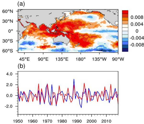 图1: (a) 去趋势后SST异常的第三大本征微观状态(HWP)的空间分布。(b) 9-10月西北太平洋TC生成频次(红线)与2-3月HWPI(蓝线)的标准化时间序列,均去除了7年滑动平均和线性趋势。