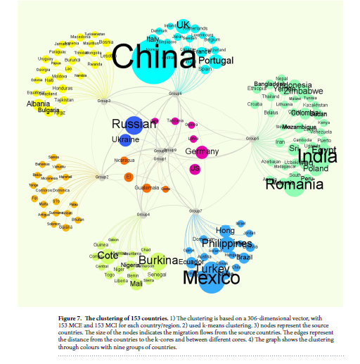 首先,两国之间的移民壁垒对于移入者和移出者呈负相关。简单而言,拥有较高移入成本的国家对移民的吸引度欠佳,其国民离开该国的意愿也更加强烈。其次,我们运用移民壁垒对各国进行聚类分析,试图就多边移民模式对各国进行分类,其结果呈现较为明显的地域和经济特性,也从这个角度验证了本文迁移模型的有效性。此外,我们还试图通过回归分析将移民壁垒进行分解,发现影响迁移成本的因素非常复杂,并通过GDP增长率、人均GNI、人类发展指数HDI等宏观指标实现了对迁移成本12.5%的解读。与早期的理论不同,我们发现近十年来,语言对于移民成本的影响作用已经很小,相对而言,移民网络的影响作用显著,即目标国特定族群的规模越大,就越能降低该类移民的迁移成本。
