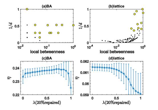 Fig. 4. (a, b) The local betweenness and local closeness of every failure nodes. The yellow circles represent first few repaired nodes in greedy recovery. The black dots stand for the rest of failure nodes (logarithmic coordinate in X axis). (c, d) The dependence of transportation efficiency on hybrid index λ when the network is 20% repaired.