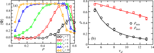 FIG.3 Dependence of density on drift velocity for ordered states. In panel (a), the average order parameter ⟨Φ⟩ is shown as a function of the density for θ=0, b=8, H=2, and several values of the drift velocity vd. In panel (b), we show the maximum (red squares) and minimum (black circles) densities for which ⟨Φ⟩=1, as functions of the drift velocity. A power-law fit for the minimum density yields ρmin=17.6v−2.03d, whereas a linear fit for the maximum density gives ρmax=0.919−0.032vd. The equations extracted from the fits meet at two points, namely, vd≈4.67 and vd≈28.09.