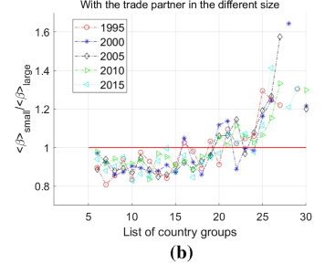 另外,对于每个被考察国家,本文对比分析了其出口到不同规模贸易伙伴间显著性商品的技术含量差异,可以看出,小体量的国家往往在出口商品的类型上选择不多,但随着经济体量的增加,越来越多的国家倾向于向较小的贸易伙伴出口高技术商品,而向较大的贸易伙伴出口低技术商品,这验证了国际贸易关系的一个普遍性特征(图2左)。同时,通过对被考察国家的进、出口商品的技术差异进行分析,本文指出一个国家的贸易结构将随着其经济体量的增加而得到改善,即出口的高技术商品将逐渐超过进口的高技术商品,这种差异性也会持续增加,并且,这二十年间,其贸易结构的反转点往往出现在GDP排名相对固定的位置(图2右)。此外,本文还通过理论推导,证实了贸易结构升级与GDP增长之间的这个对数线性关系,表明确实存在着显著的贸易类型反转现象和演化规律。