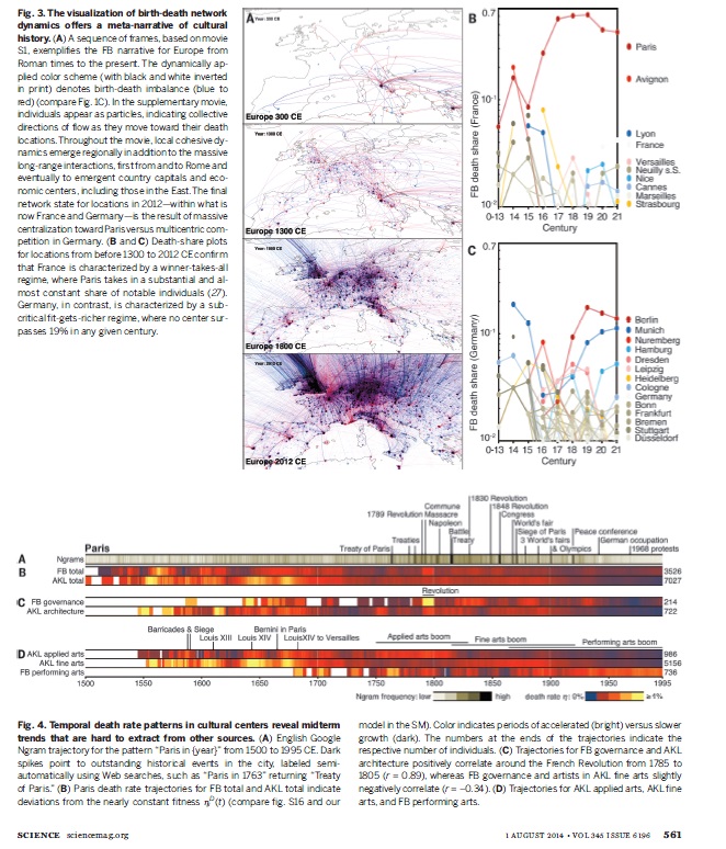 2014年8月1日发布的最新一期《科学》杂志刊登了美国学者Maximilian Schich的最新研究报告。笔者通过分析过去2000年来杰出人士出生和死亡地点的数据集,将定量与定性观点进行整合,从全新的角度分析了文化的流动性,该研究中所用的分析框架可能将促发人文科学领域更有力分析方法的引入。为了更好地理解在其它复杂文化过程中疾病的扩散、冲突的兴起以及城市的演变,研究人员需要一种定量分析个人历史发展对社会实践影响的方法,定性或定量的研究一直是该领域的常见方法。Maximilian Schich及其同事联合这两种方法来研究2000年来欧洲和北美的文化流动性。作为不同时代思想和技能流动的个体代表,研究人员描绘了超过15万名著名人物的迁徙模式,这些人的迁徙模式是用他们的出生和死亡地点来代表的,这份迁徙记录从希腊立法者和诗人梭伦(出生于公元前637年雅典,死于公元前557年塞浦路斯)到Jett Travolta(演员John Travolta的儿子,出生于1992年洛杉矶,死于2009年巴哈马),囊括了2000年来的不同领域的知名人士。Schich等人将来自物理学和生物学等领域的定量分析方法应用于这一数据集,揭示了某些地点随着时间而改变的个体“吸引力”模式,并指出这些模式偏差的历史相关性可用定性方法进行解释。该团队还使用这些数据创建了一段视频,从公元前600年到2012年,每个人的出生地点在地图上以蓝点标注,死亡地点以红点标注,在这个动态地图上,我们能看到文化历史的变迁,越多的名人在一个城市死亡,说明这个城市的文化、经济越繁荣昌盛。Schich的Birth to Death 迁移地图反映出了一些公认的历史事实,比如罗马作为文化中心被巴黎取代,但最终又被洛杉矶和纽约取代。研究人员指出,在没有其大规模可视化工具时进行分析的情况下,用他们的框架所揭示的连贯全球模式将有助于预测文化流动模型下一步的生长、体型、距离分布,从而更好地为解读文化现象提供指导。