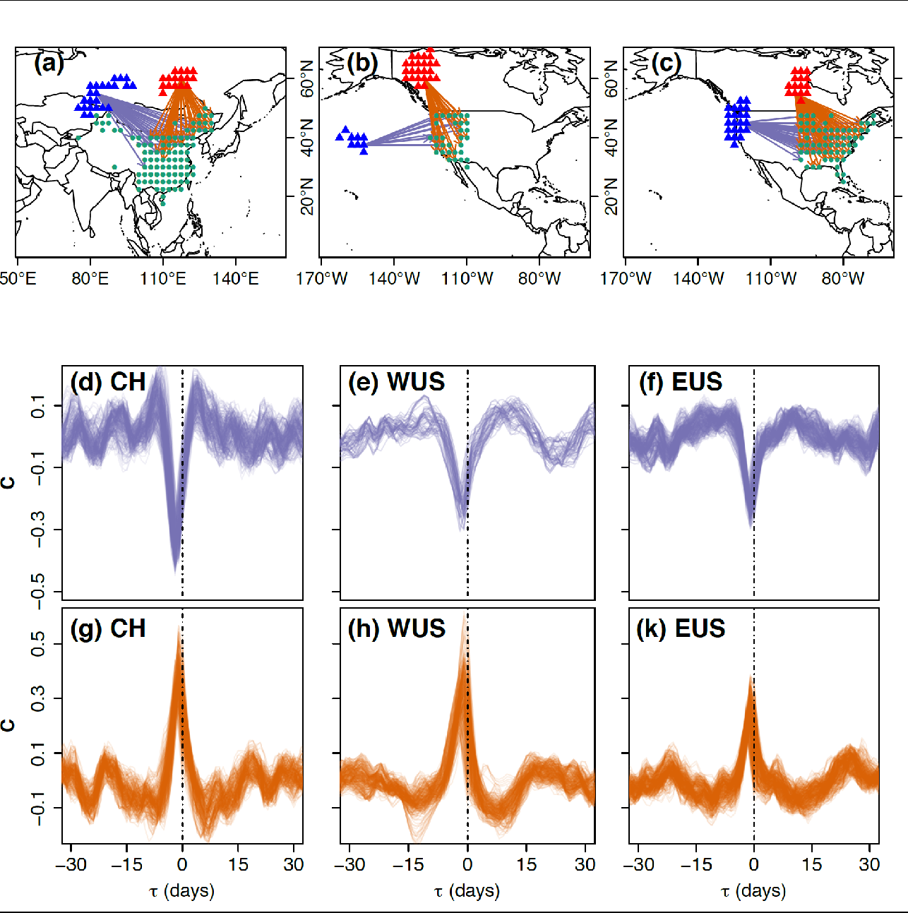 Figure 1.强负关联(蓝色)和正关联(红色)地域的分布。(a)对应中国中东部,(b)和(c)对应美国西部和东部。(d)至(k)为不同地区的关联函数。