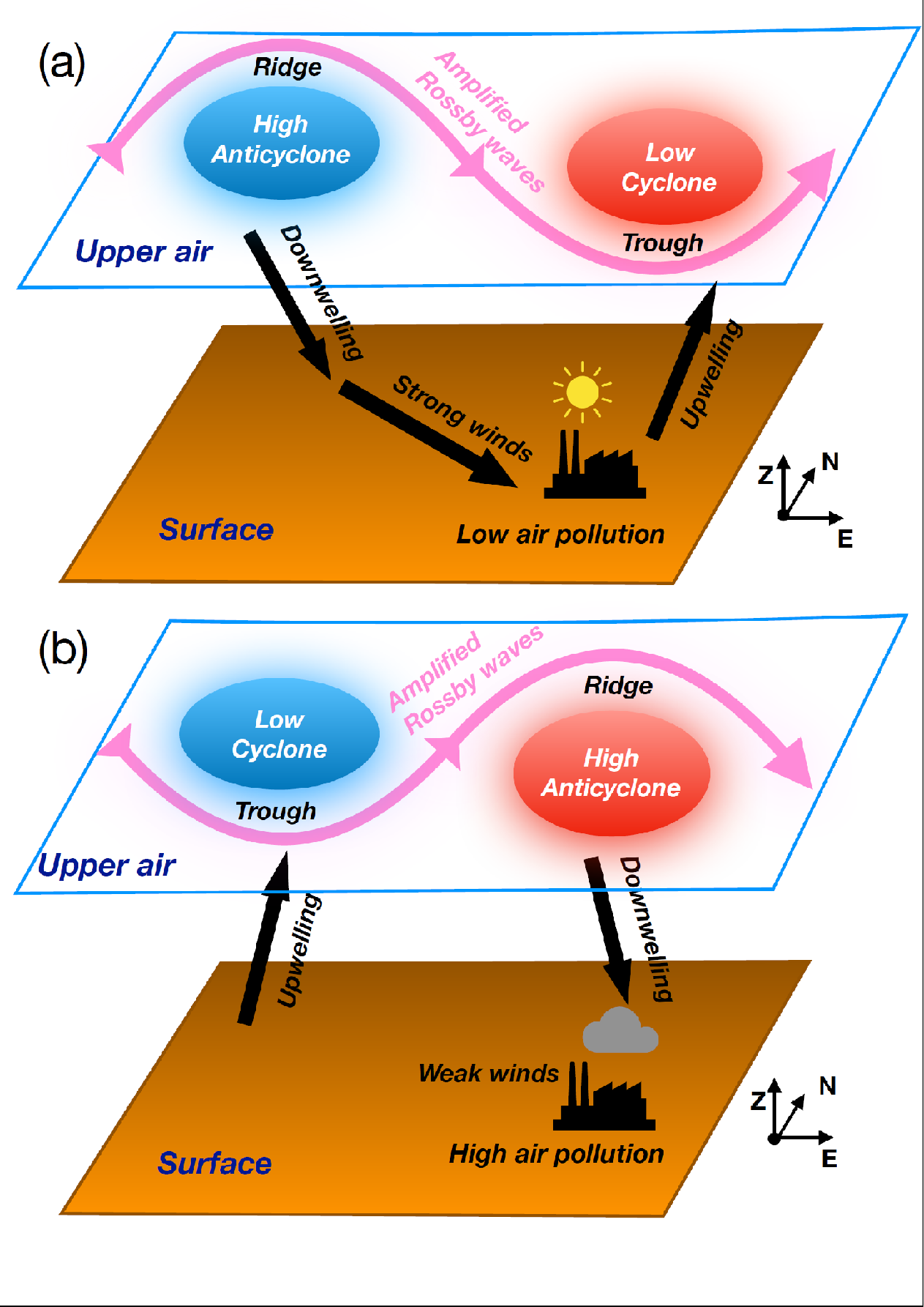 Figure 2.Rossby波引起不同大气条件的示意图。(a)和(b)分别对应于低和高空气污染条件。