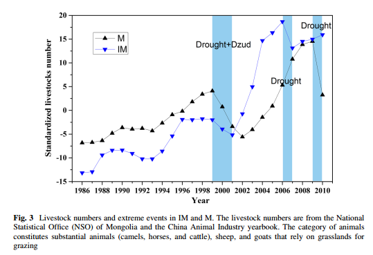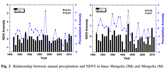 简介:目前干旱半干旱区是国际研究热点区域,因为气候变化对这些地区的的植被和畜牧业等早已经产生了巨大的影响。本文基于气象学数据、GIMMS AVHRR NDVI3g数据和牲畜记录,通过统计学分析,了解到在这些区域正发生着强烈的变暖和降水量的下降。降水模式正在改变,并且频率越来越高的极端气候,比如干旱等,都是危害到植被生长和畜牧业发展的主要原因。通过对比分析,我们探索了内蒙和外蒙这两个区域的植被和畜牧业分别对气候变化和极端气候的响应。我们发现,植被生长大体从十九世纪中期开始下降,然后从2001年起又开始恢复。内蒙的农业集约化水平比外蒙高,并且内蒙的居民比外蒙的居民对气候变化有更加强烈的感觉。为了解决这些问题,我们呼吁未来更多关注着这个地区的极端气候研究。