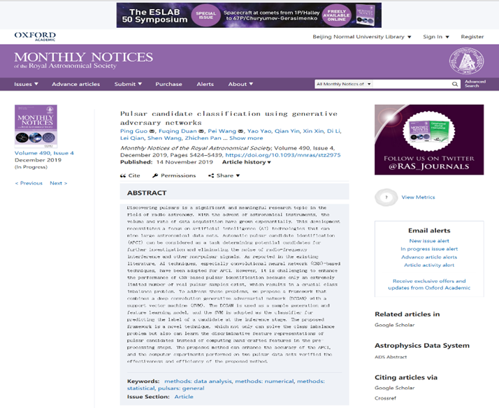 成人色情 图形图像与模式识别实验室(IGPR)郭平教授课题组在人工智能与天文学交叉研究领域取得进展。近日,该成人色情 以“Pulsar candidate classification using generative adversary networks”为题,在天文技术与方法领域TOP期刊《Monthly Notices of the Royal Astronomical Society》在线发表。