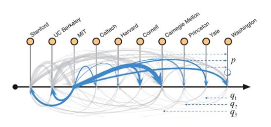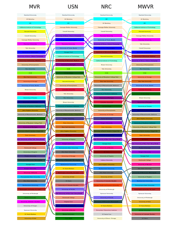 基于整个系统的似然函数极大,利用博士毕业工作的流量数据可以对各个大学进行一个排序。所得到的序列和一些权威机构,包括U.S. News和National Research Council的排名具有很大的相似性,如下图所示。