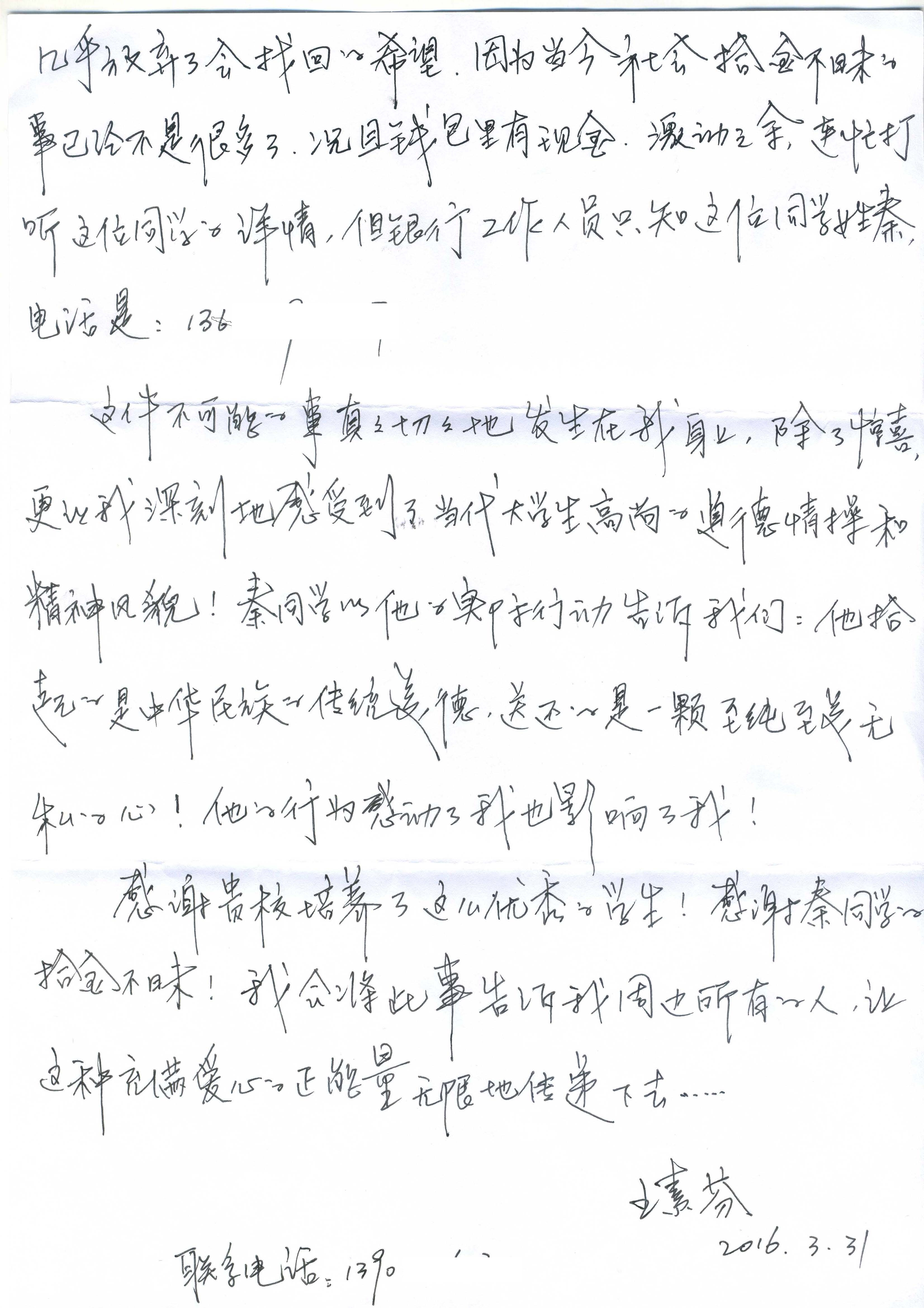 2016年3月30日下午,成人色情 2014级硕士生秦磊在中国银行文慧园支行捡到钱包,内有银行卡、身份证及现金千余元。秦磊同学捡到钱包后第一时间交到银行的服务台,清点钱包内财物后未留姓名离开。当天,银行工作人员将钱包归还失主。