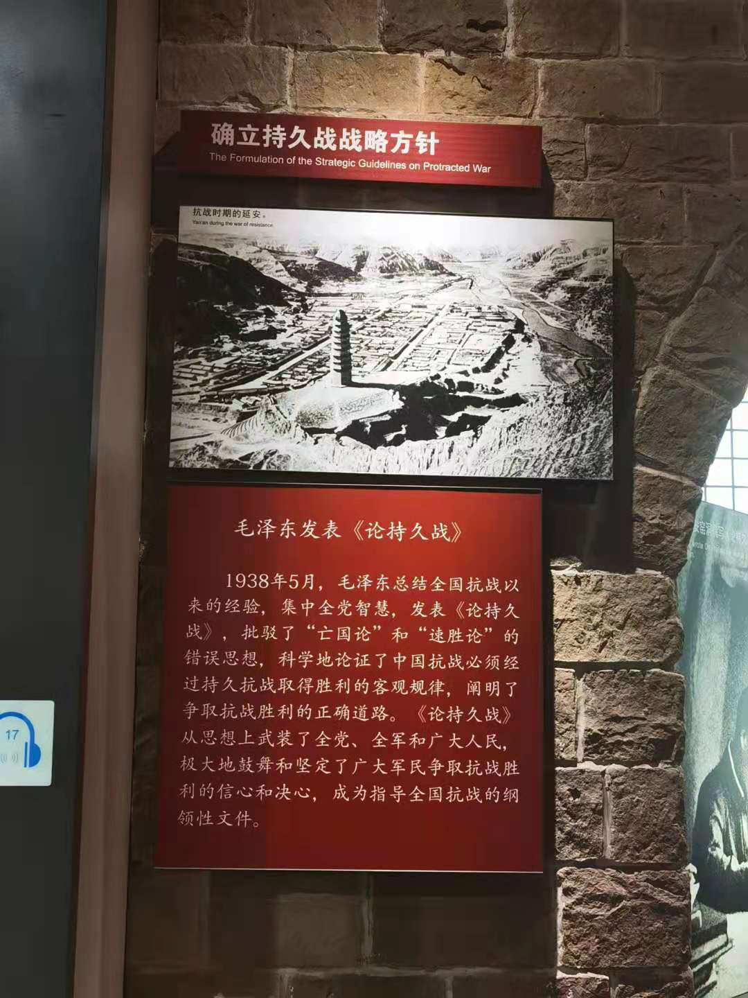 第三个板块的主题是中流砥柱,展览介绍了在抗战过程中,中国共产党主张实行全面、全民族抗战路线,广泛发动人民群众,提出“持久战”方针和一整套作战原则,对抗日战争实施了正确的战略指导。中国共产党成为坚持抗战、坚持团结的中坚力量,成为抗日战争的中流砥柱。