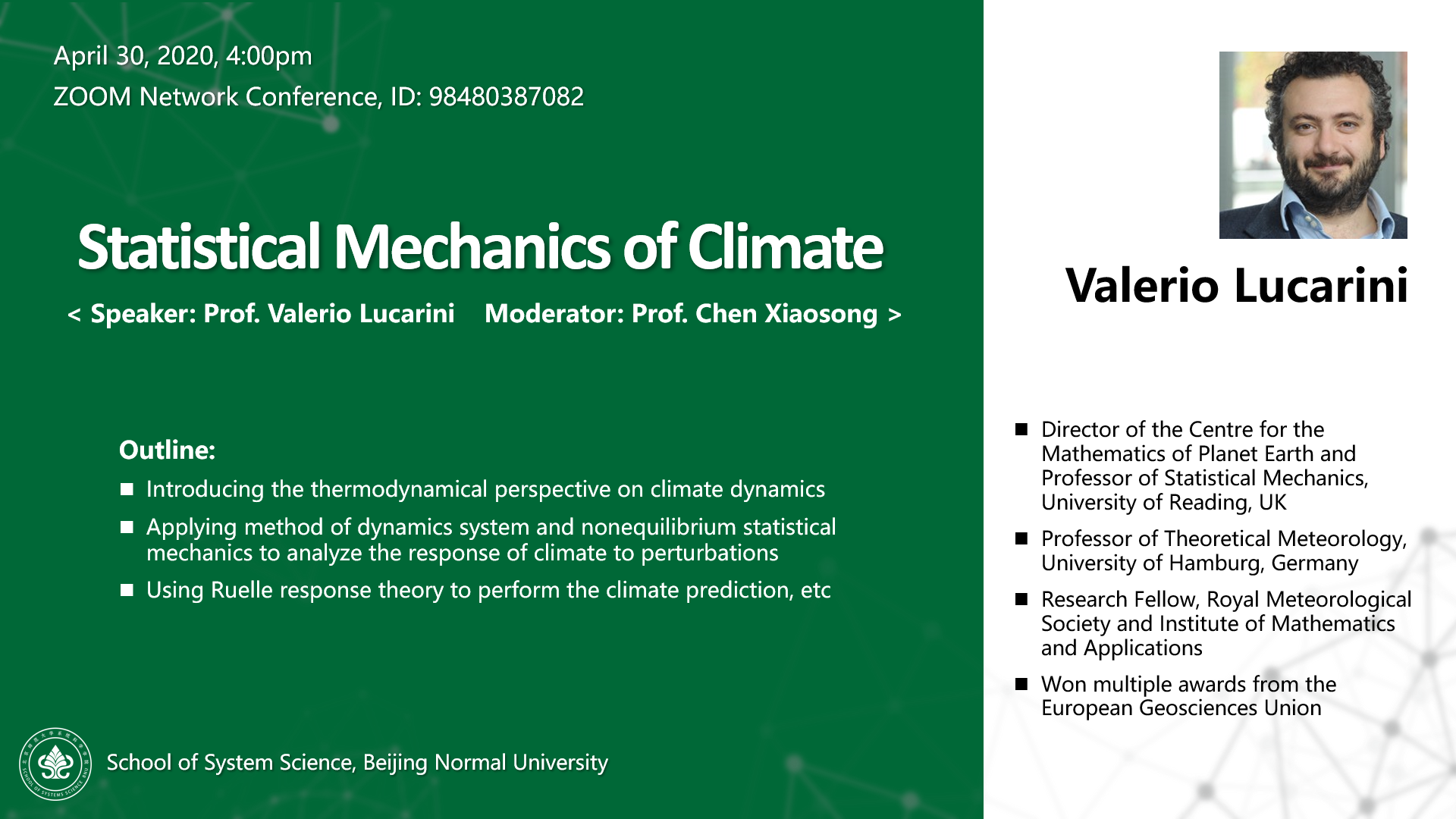 Valerio Lucarini教授是英国雷丁大学行星地球数学中心主任兼统计力学教授、德国汉堡大学理论气象学教授、皇家气象学会和数学及其应用研究所研究员,曾多次获欧洲地球科学联合会奖项和伦敦数学学会奖项。研究方向主要为气候动力学、极端天气、非平衡系统的统计力学、动力系统、随机过程、非线性光学等。