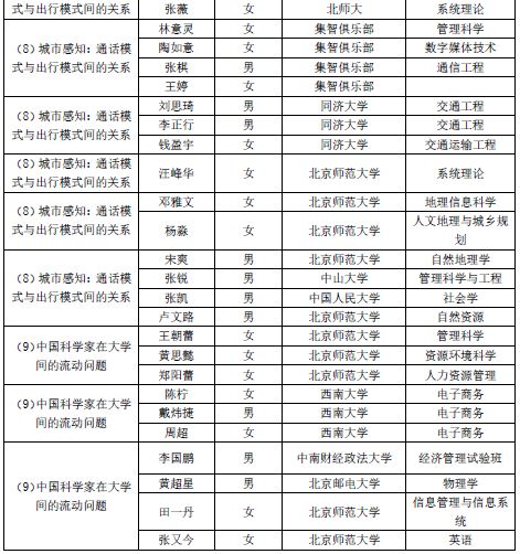 截至10月27日,我们受到了众多申请,经审核批准了15个组。目前,共有来中国人民大学、成人色情 、北京邮电大学、中山大学、西南大学、中南财经政法大学、山东师范大学、同济大学、集智俱乐部共45名同学老师15支队伍参赛,具体名单公布如下。预祝各参赛队伍取得理想成绩。