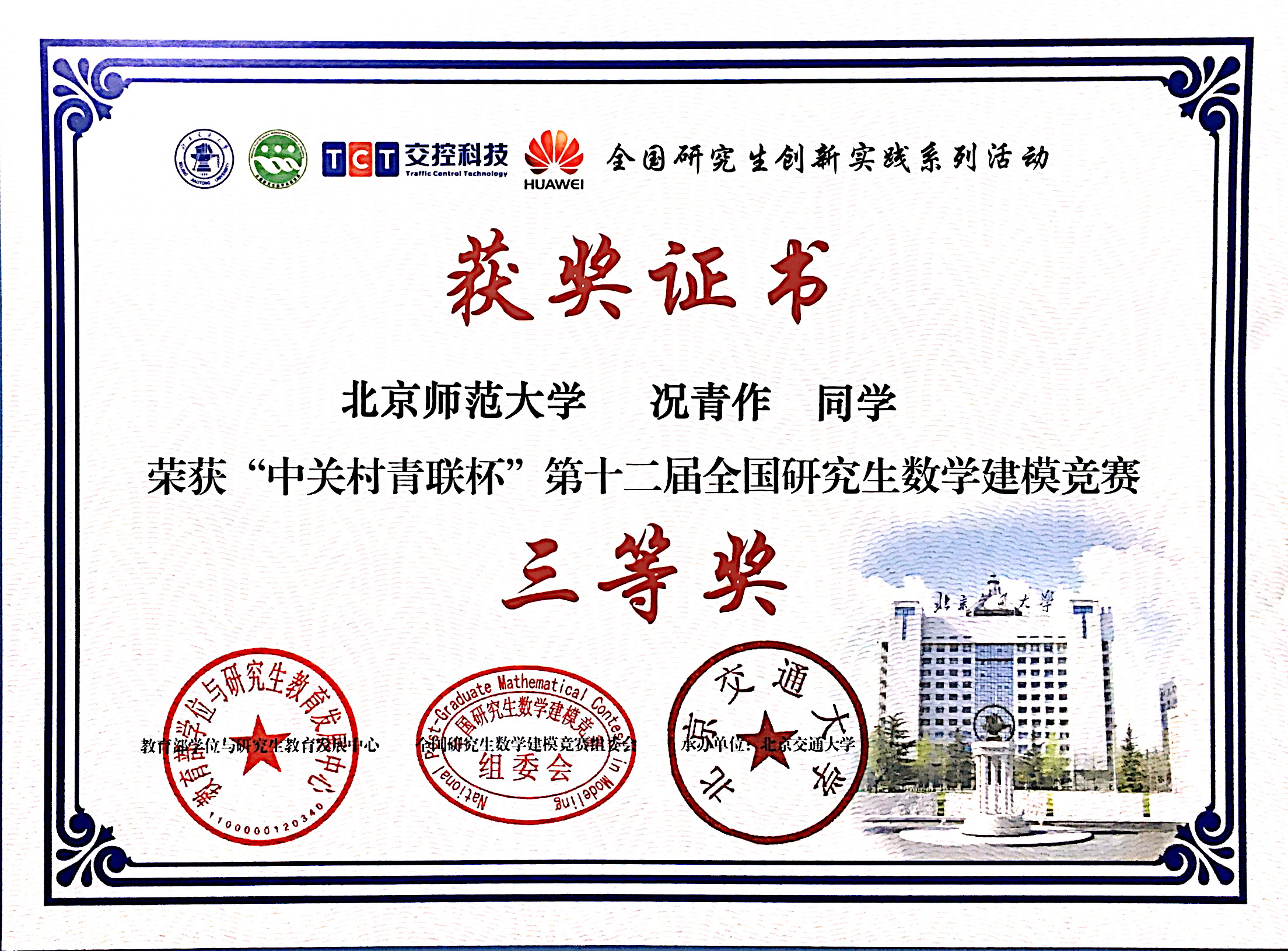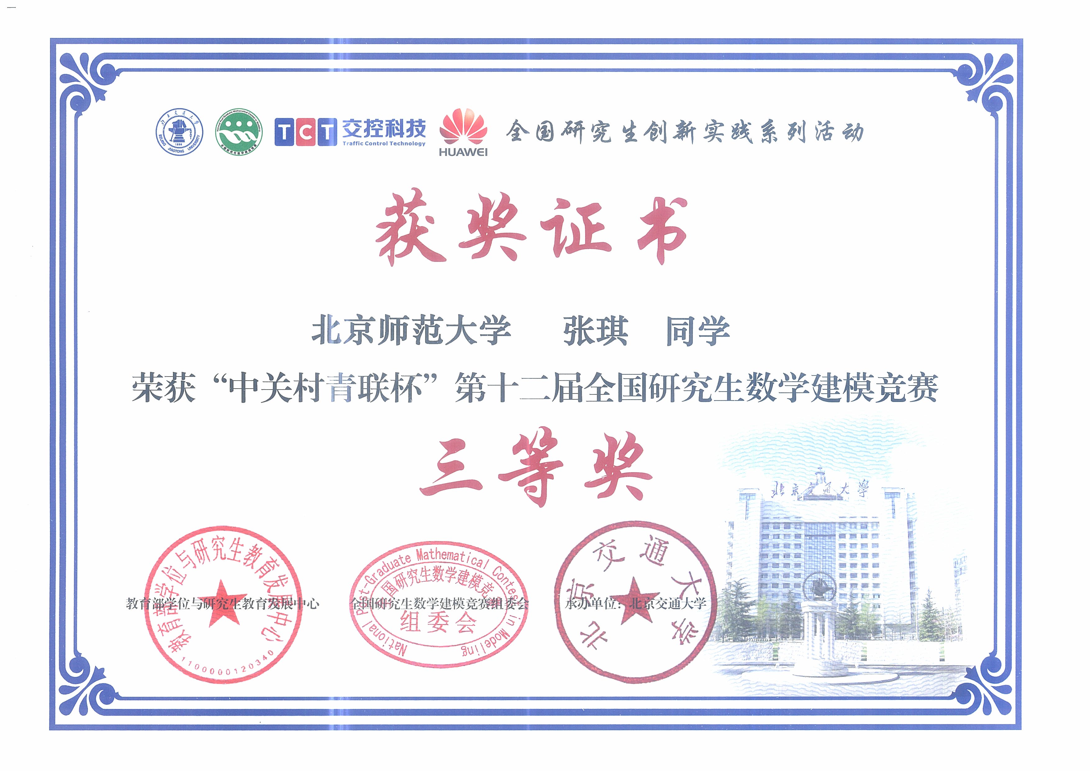 2015年12月,在“中关村青联杯”第十二届全国研究生数学建模竞赛中,成人色情 硕士研究生曹雪薇、马玉财荣获二等奖,况青作、张琪和周幻园荣获三等奖。